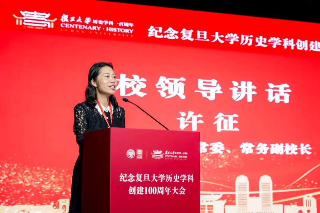 许征同志代表学校向历史学科百年华诞表示热烈祝贺。她指出,复旦史学创立于国家忧患之际,与民族共命运、与学校共进步,是我校办学历史最悠久、学术影响力最卓著的系科之一,是复旦人文社科的一面旗帜。百年来复旦史学学人荟萃、学脉绵长,陈守实、周予同、耿淡如、周谷城、王造时、蔡尚思、谭其骧、胡厚宣、杨宽、章巽、田汝康等大师奠基立业,改革开放以来又培育和引进了一大批在学界声望崇高、成就斐然的中青年领军人才,培养了一代又一代优秀学子,留下了一部又一部传世之作、经典之作,成为享誉海内外的史学重镇。结合习近平总书记致复旦大学建校120周年的贺信精神,许征代表学校就推动复旦历史学科高质量发展提出期望:一是求索以史鉴今、以史育人之学,推动历史学知识创新;二是树立自主自立、见微知著之识,走好中国史学自己的路;三是培育兼容并蓄、融汇贯通之才,在文科建设上发挥示范引领作用。许征表示,学校将一如既往地全力支持历史学科创新发展,同社会各界和广大校友一道,共同推动复旦史学谱写新的辉煌篇章。