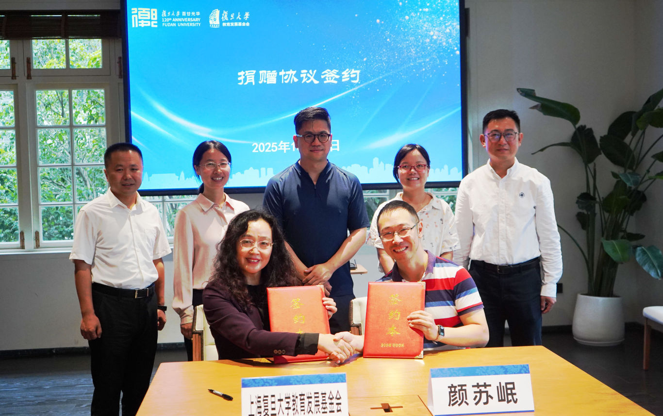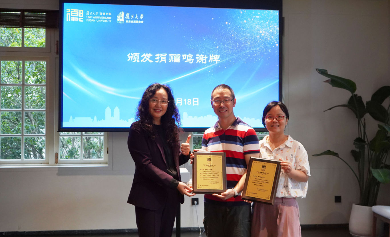 交流发言结束后,刘莉与颜苏岷校友分别代表复旦大学教育发展基金会与捐赠方签署捐赠协议,并代表基金会向捐赠人颜苏岷、陈虹校友夫妇赠送捐赠纪念牌,与会人员一起合影留念。
