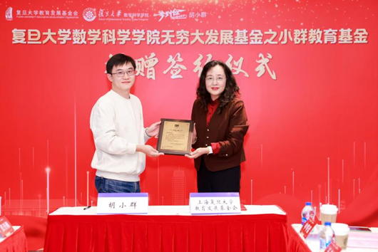 10月29日下午,复旦大学数学科学学院“无穷大发展基金之小群教育基金”捐赠签约仪式在邯郸校光华楼举行。捐赠人、“胡小群讲数学”创始人、2004级院友胡小群,“胡小群讲数学”联合创始人、2004级院友董剑君,中国科学院院士、数学科学学院院长沈维孝,复旦大学对外联络与发展处处长、上海复旦大学教育发展基金会秘书长、校友总会执行秘书长刘莉,数学科学学院党政领导班子成员等出席活动。数学科学学院党委书记王光临主持仪式。