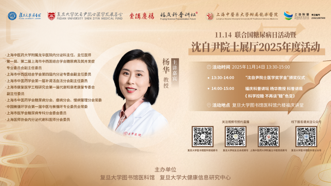 11月14日下午,福庆讲堂沈自尹院士展厅2025年度活动暨福庆科普讲坛联合国糖尿病日活动在复旦大学图书馆医科馆举办。复旦大学党委常委、上海医学院党委副书记、副院长徐军出席活动并致辞。上海中医药大学附属龙华医院内分泌科主任杨华教授作福庆科普讲坛中西医结合科普讲座。沈自尹院士家属沈蔚女士、史红根先生,上医1991级临床医学专业校友、上海中医药大学附属龙华医院眼科张宇燕主任,复旦大学对外联络与发展处阳德青副处长,复旦大学上海医学院党委学生工作部(处)于专宗副部长等出席,活动由复旦大学图书馆副馆长应峻主持。本次活动通过复旦大学图书馆医科馆视频号和龙华医院视频号直播,复旦大学校友会视频号也同步开启首场直播直播,共吸引8200余名观众观看,点赞超1.46万次。