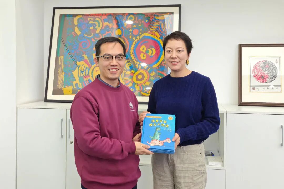 ▲仲英青年学者郑克(上)、王放(下)向基金会赠送基金会资助出版的科普书籍和文创纪念品