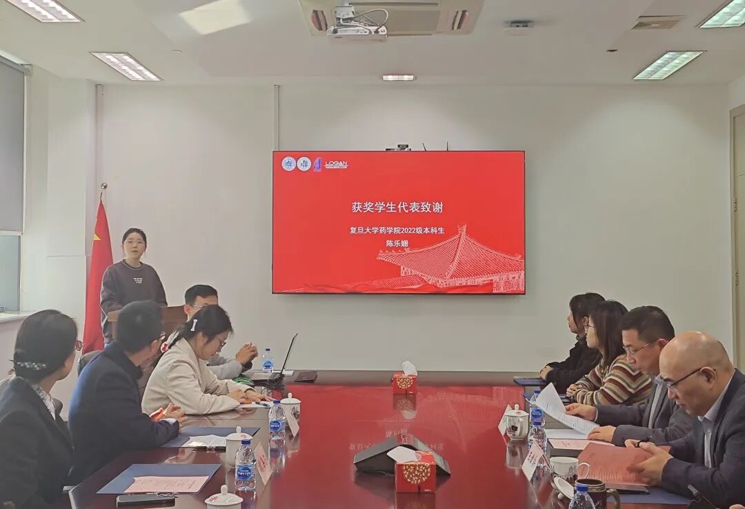 两位获奖学生代表先后登台发言。2022级本科生陈乐姗阐述了她对LOGAN公司的认识,并介绍了自己在学业成绩、科研项目以及药学院“法莫西”学生讲师团中的科普实践经历,强调LOGAN奖学金激励她刻苦学习、坚实专业初心,在药学道路上不断追求卓越。