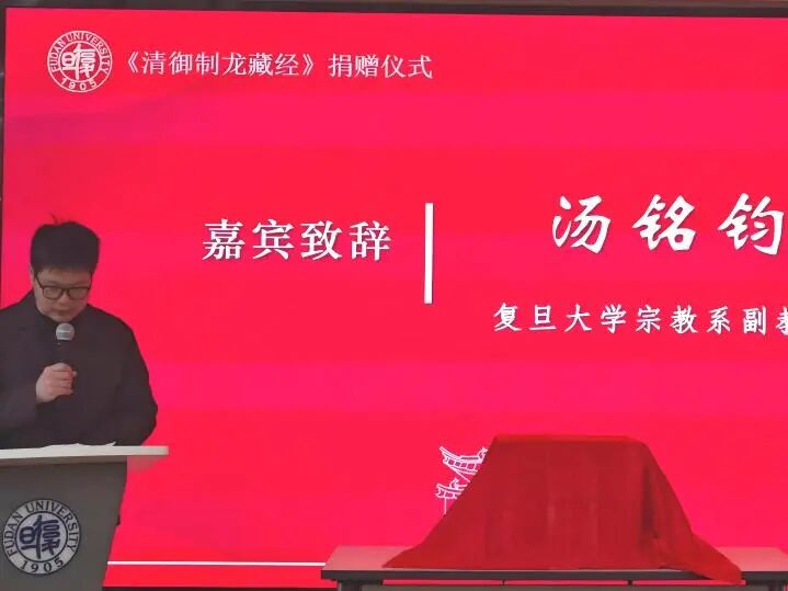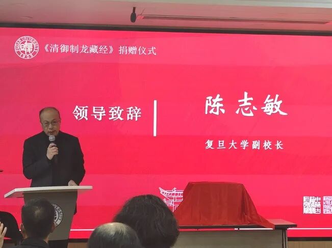 仪式上,陈志敏副校长代表复旦大学向延藏先生和杭州国家版本馆表示感谢。他指出,这套《大藏经》的入藏,对复旦大学的古籍收藏、学术研究和文化传承都具有积极意义,这是复旦大学首次入藏木板刷印的大藏经,为教学与科研提供了重要的实物资料。未来,中华古籍保护研究院将重点做好三方面工作:一是开展专业保护与数字化存档,确保文献安全;二是组织跨学科研究,深入挖掘其文献与历史价值;三是通过展览、课程等形式,向师生和社会公众展示推广,发挥其文化教育作用。