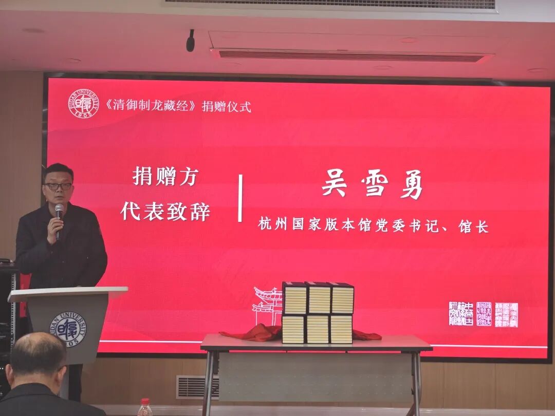 12月24日下午,《清御制龙藏经》(下称《乾隆大藏经》)捐赠仪式在复旦大学理科图书馆报告厅举行。北京文物保护基金会名誉理事长延藏先生通过杭州国家版本馆馆长吴雪勇先生,向复旦大学捐赠全套乾隆原版刷印本《乾隆大藏经》,共计725函、7245册。这套珍贵的文献正式由复旦大学图书馆接收,并由中华古籍保护研究院负责后续的保藏与研究。