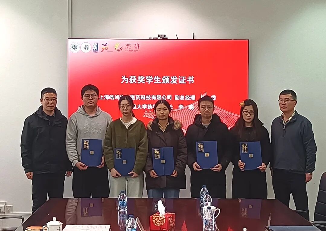 3月10日下午,复旦大学药学院乐研奖学金颁奖仪式在张江校区药学院科研楼举行。上海皓鸿生物医药科技有限公司(以下简称“皓鸿公司”)副总经理陈委、市场经理林江、上海销售经理于明超,复旦大学药学院院长李聪,党委副书记史雪茹、王盛,以及学生代表参加活动。活动由王盛主持。